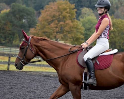 As Level 3 progresses: Confident trotting over single 18” cross rails in a straight line while maintaining a rhythmic trot. Willing to confidently ride horses levels 1-3. Can demonstrate a proper half-halt. Can ride a smooth posting trot with heels down, legs and hands quiet, body tall, and on the correct diagonal; able to adjust speed at any gait using half-halts; able to post the trot 3 full laps without stirrups and addressing diagonals; able to change from half-seat to full-seat while cantering; become secure at the canter and demonstrate it by cantering on the lunge line without holding on to the reins or to the saddle for approximately one minute. Able to pass other horses in the ring, allowing sufficient spacing, and alerting the other rider with “inside/outside”; canter a single vertical. Able to ask horse to lengthen and collect at the walk & trot, know the difference between working, collected and extended gaits. Begin to understand movement of the horse and start to establish the correct diagonal without looking; able to count strides at the canter while working over small verticals.